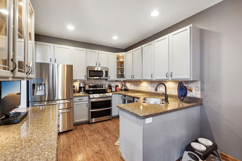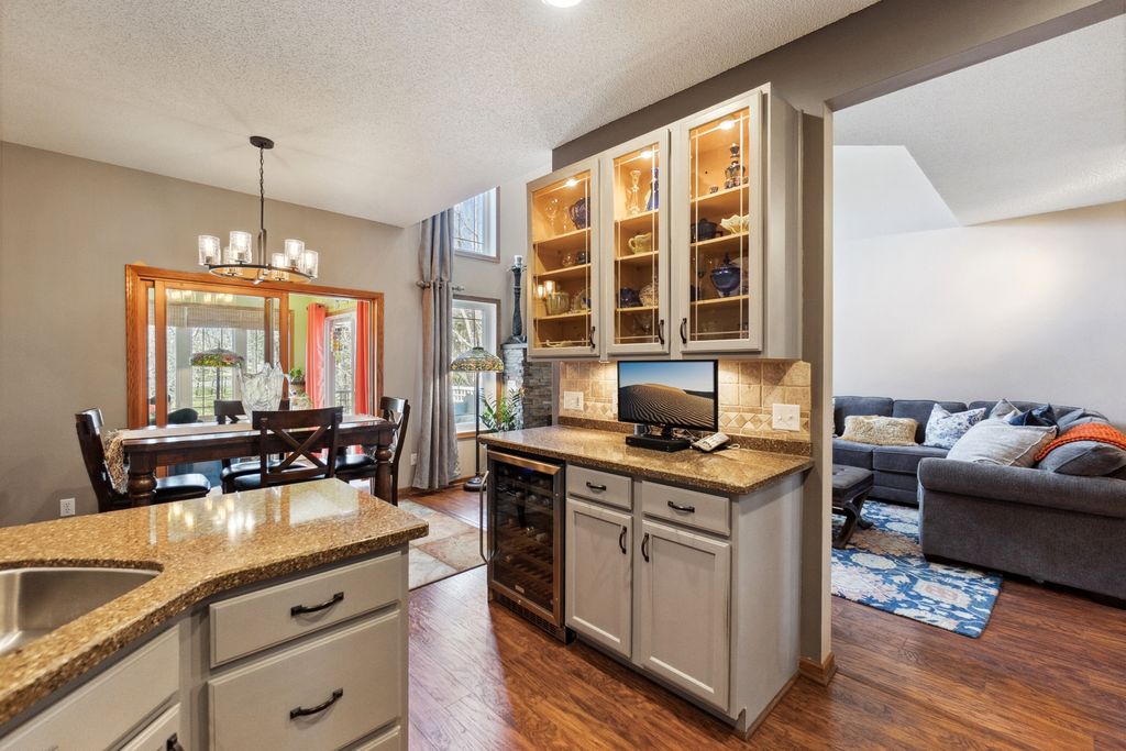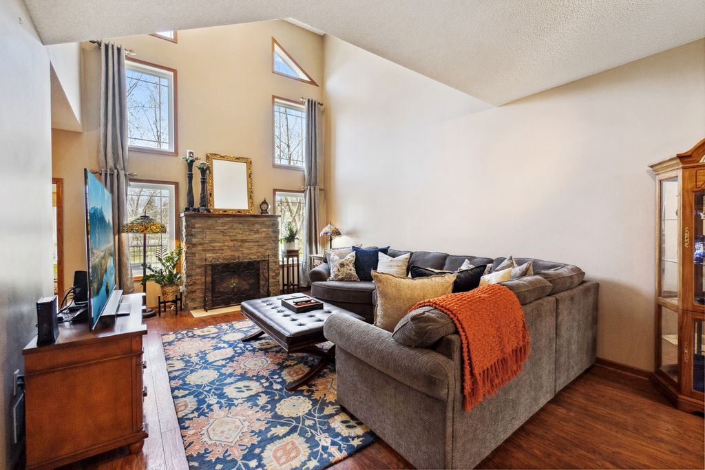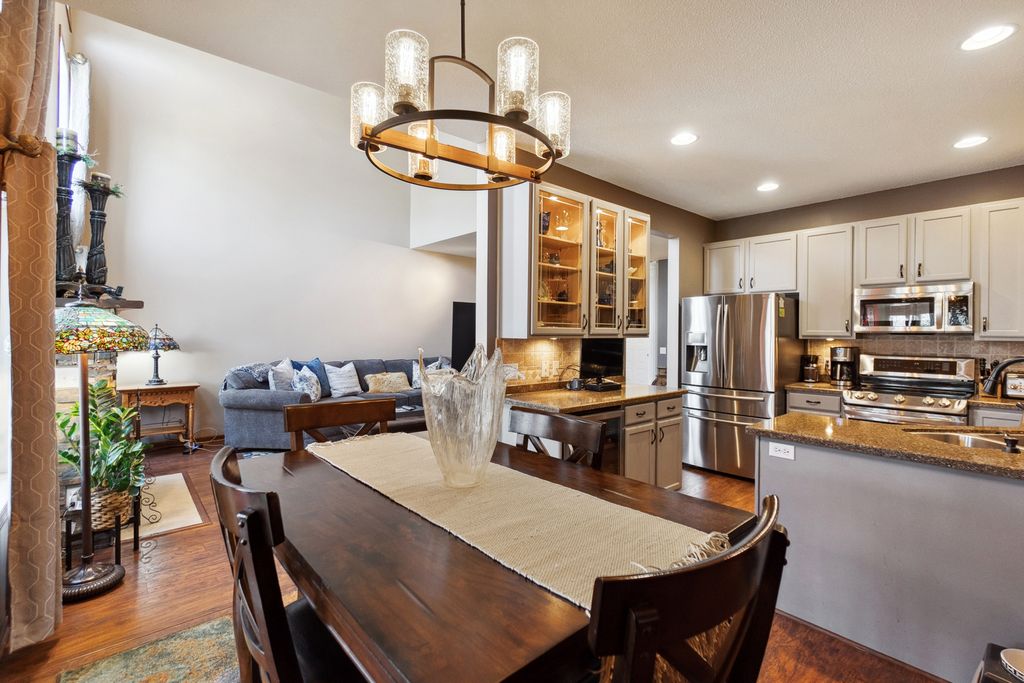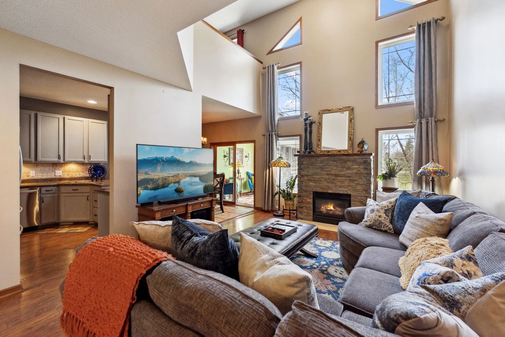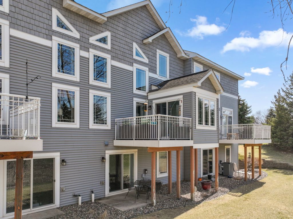 Luxurious and meticulously maintained townhome in prime Apple Valley location! This bright and spacious 3BR/4BA home offers an open-concept floor plan with soaring vaulted ceilings, a dramatic 2-story great room, and a wall of windows that fills the space with natural light. The main level features a beautifully appointed living room with a gas fireplace and a large dining area that flows seamlessly to the updated kitchen, complete with granite countertops, breakfast bar, wine fridge, and brand-new stainless-steel appliances. Step out to your private deck offering great space for outdoor entertaining and relaxation. The upper level boasts a stunning owner’s suite with vaulted ceiling, large walk-in closet, and spa-like ensuite bath with jetted tub, separate shower, and double sinks. The versatile loft offers the perfect space for a home office, playroom, or potential 4th bedroom with the addition of a wall. Convenient upper-level laundry near bedrooms. The finished walk-out lower level includes a spacious family room, third bedroom, and full bath—ideal for guests or extended living. Enjoy outdoor living with a patio, and the convenience of an attached two-car garage. Located in the award-winning ISD 196 school district and within walking distance to parks, shopping, dining, and more. Association amenities include a community pool and playground. Don’t miss this opportunity to own a stunning home in an unbeatable location!